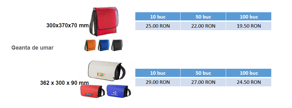 Confectionata din material netesut, cu o greutate de 70 g. Este disponibila in varianta pe rosu, portocaliu, albastru sau negru si are o dimensiune de 300 x 370 x 70 mm. Personalizarea se poate realiza pe o suprafata de 120 x 80 mm. Fac parte din acele genti de umar care, dupa personalizare, pot fi incluse in cadrul cadourilor corporate si oferite propriilor angajati sau altor categorii de stakeholderi.