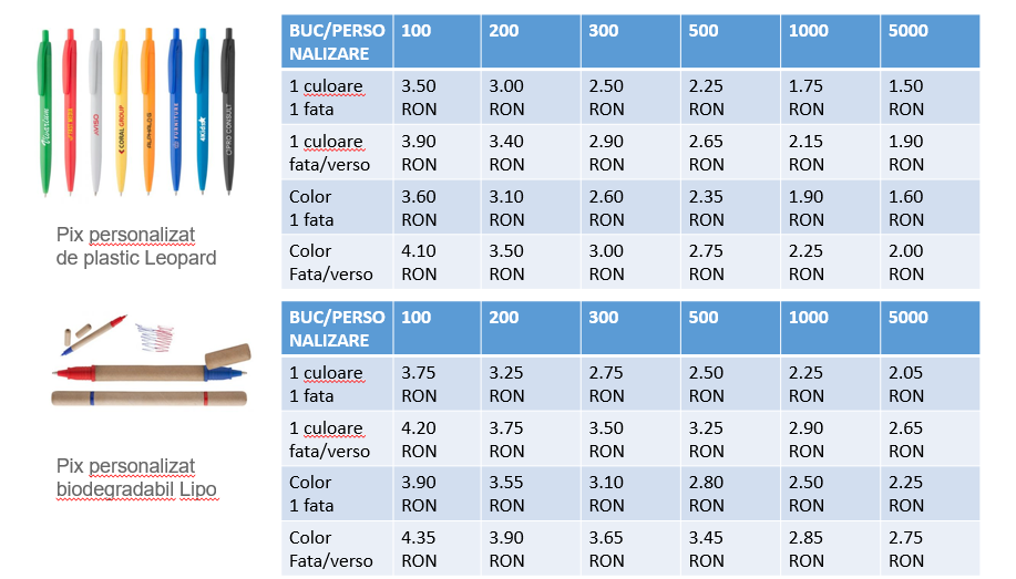 Prin intermediul acestui site puteti comanda pixuri personalizate dintr-o gama variata. Preturile pentru serviciul de personalizare pixuri pot fi calculate pentru fiecare tip de pix in parte. Personalizarea se poate face intr-o culoare, in doua culori sau in policromie